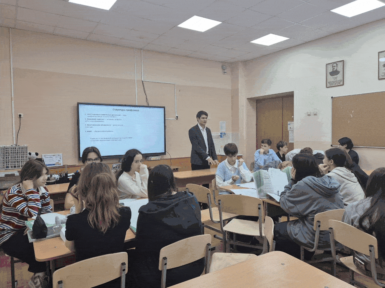 прошел профсоюзный урок на тему: «Российские профсоюзы: история и современность», который провел Фомин Илья Алексеевич. Мероприятие проходило в формате живого диалога, что позволило создать атмосферу открытого общения и активного обмена мнениями.